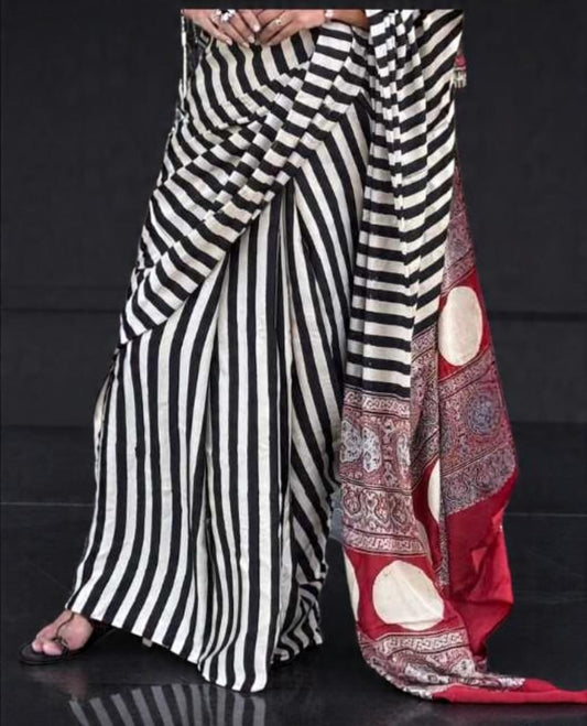 Pure Ajrakh Modal Silk Saree – Black & White Stripes with Brick Red Veg Dye | Gruhini Silks