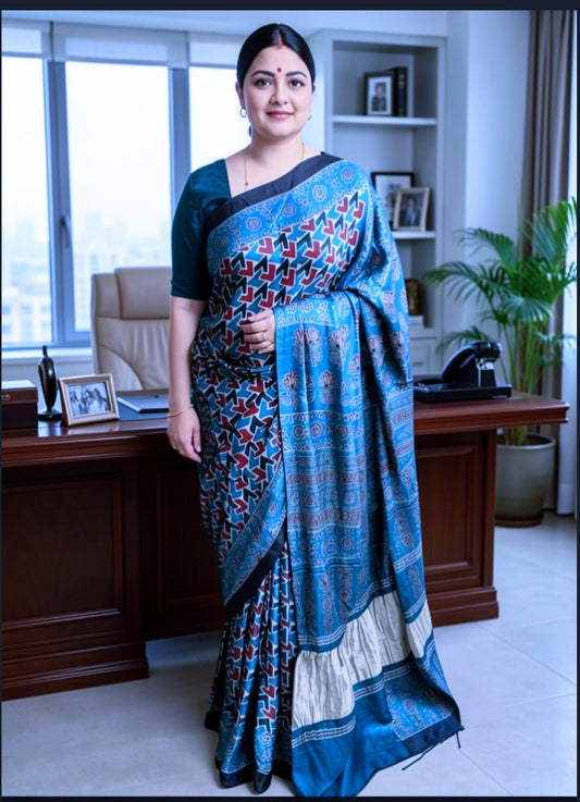AJRAKH MODAL SILK Saree- Handcrafted veg dye