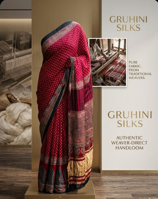 Pure Handloom Ajrakh Modal Silk Saree with Tissue Pallu | Signature Block Print Saree | Gruhini Silks