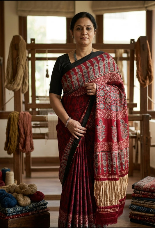 Buy Ajrakh Modal Silk Saree with Lagdi Pallu | Handloom Block Print Saree Online