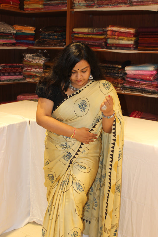 Ajrakh Modal Silk Saree Cream Black