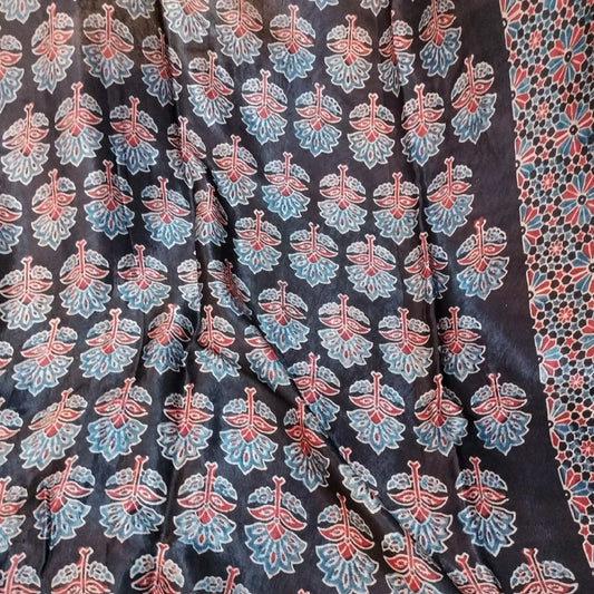 Ajrakh Modal Silk Saree black with Brick